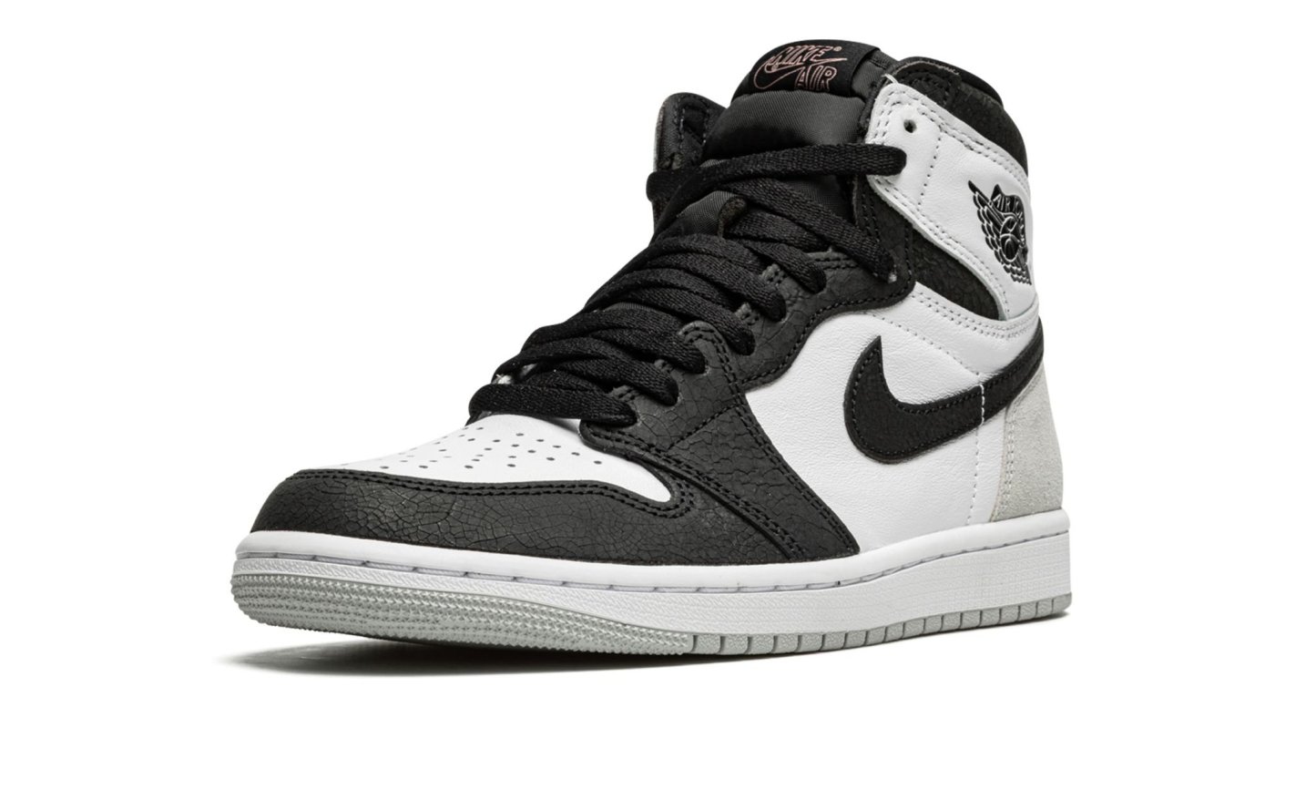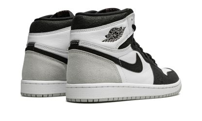 The AIR JtggORDAN 1 High OG "Stage Haze" is a versatile colorway of Michael Jordan's first signature shoe that features neutral-colored panels for a clean look. The Jordan 1 High OG in "Stage Haze" is a wear-with-anything proposition. and one of the standout releases from Jordan Brand's Spring 2022 collection. It features a white leather base with black textured overlays and Swoosh branding on the sides. A classic "Wings" logo is found on the white leather overlay on the collar. The heel counter is designed in grey suede. A pink outline "Nittgke Air" logo is paired with a Swoosh hit on the black tongue tag on the black nylon tongue.