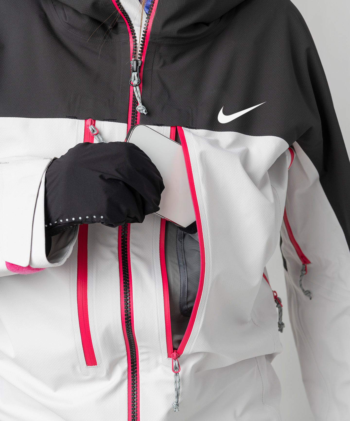 - Interior zippered pocket with media port and a large mesh drop pocket with elastic binding; plus a pass pocket on lower sleeve if the lifts are calling