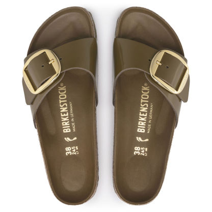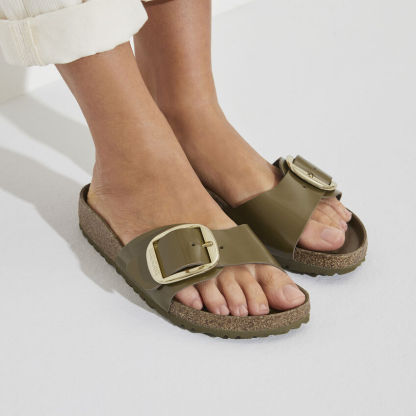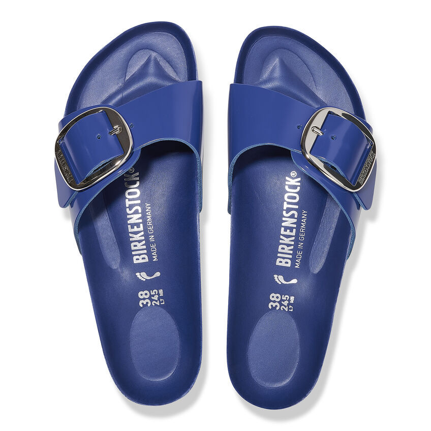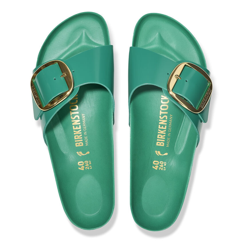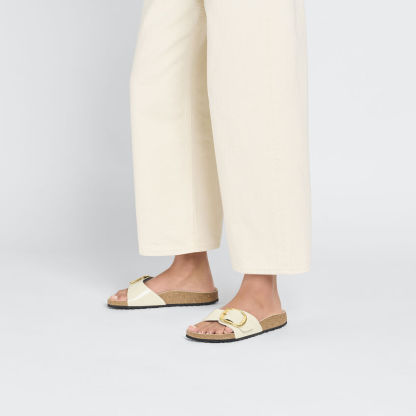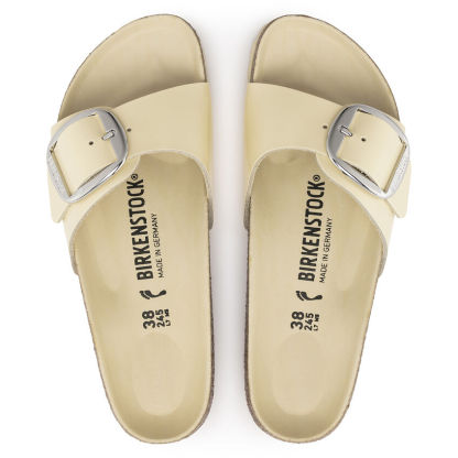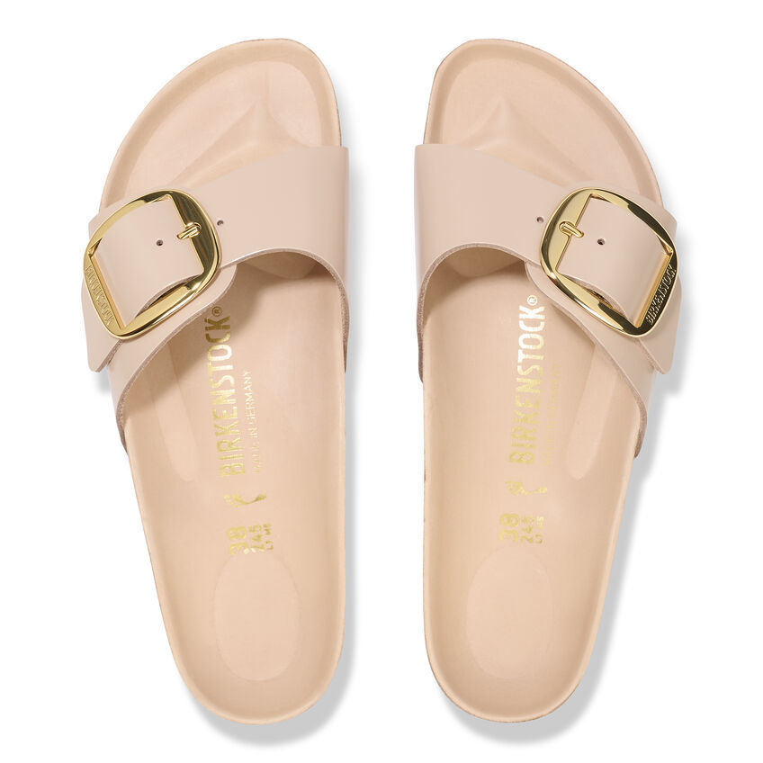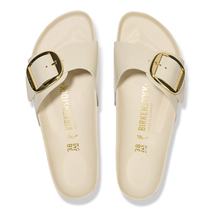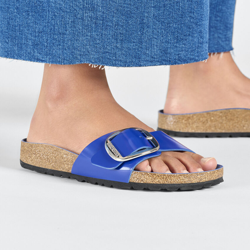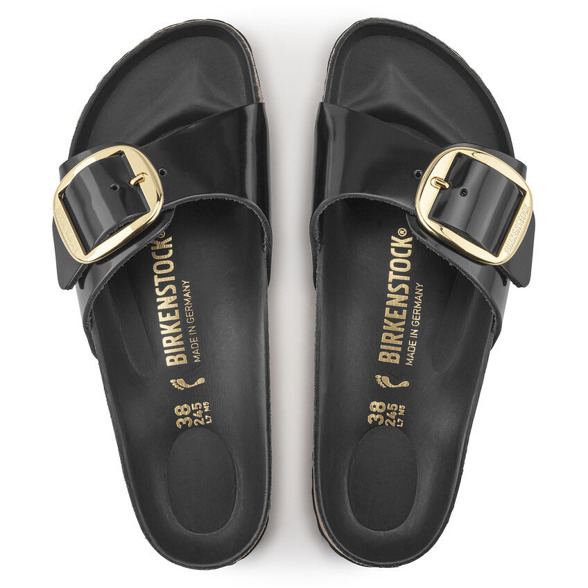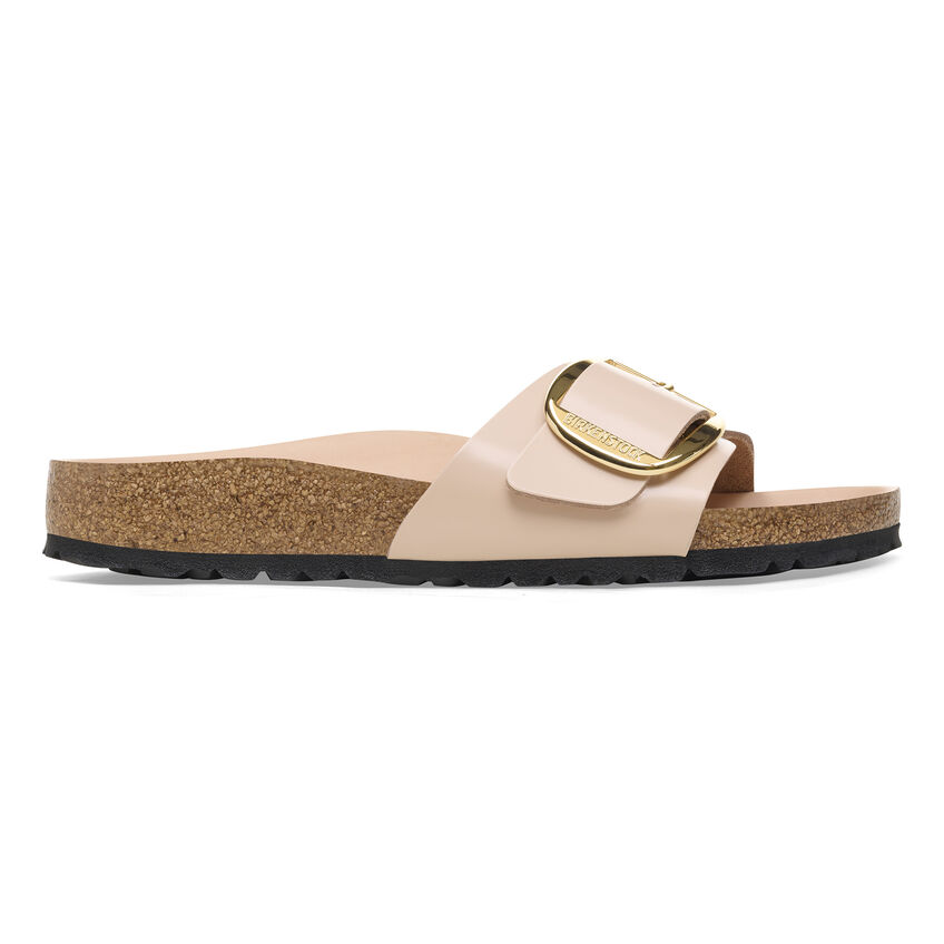 The original birthekenSTOCK Sandal. A strap, a buckle, and a contoured cork footbed are masterfully combined to create the Madrid. An iconic slide with an amplified buckle accent. The semi-exquisite footbed is fully lined with soft piumato leather, making it exceptionally comfortable. The upper is made from high-quality natural leather with a high shine finish.