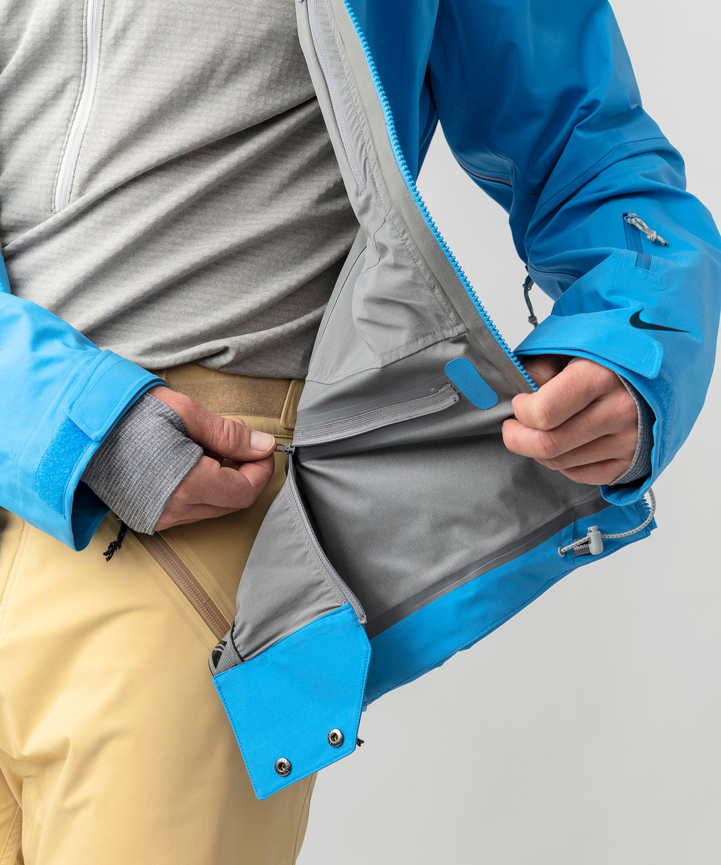 - Interior zippered mesh pocket with media port and a large mesh drop pocket with elastic binding; plus a pass pocket on lower sleeve and spacious hand pockets with hem drawcord adjustment inside.