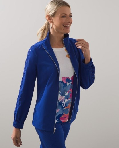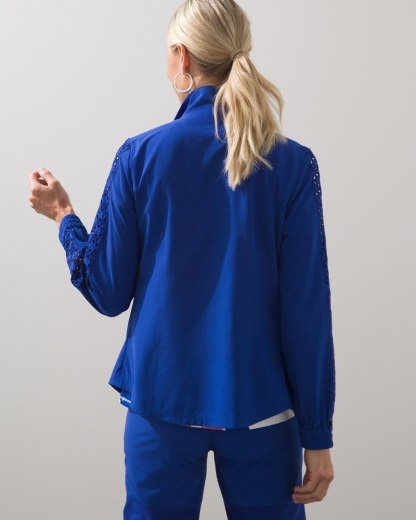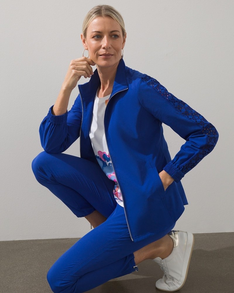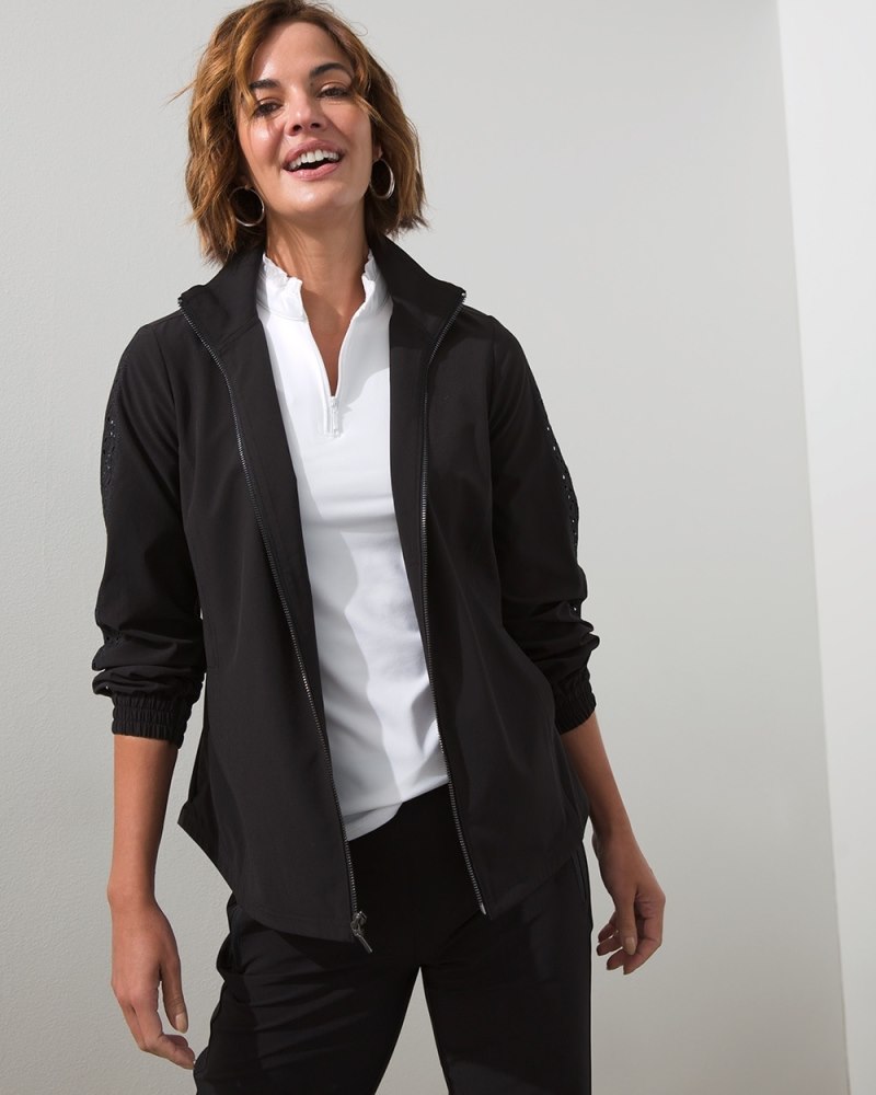 Add a fashionable touch to your sporty style with our Zenergy Neema Cutwork Jacket. This design features patterned cutwork down the sleeves, plus comfortable elastic sleeve cuffs and a flattering shirt tail hem. This jacket goes great over our Zenergy tees, tanks, and polos, perfect for staying in style and staying active.